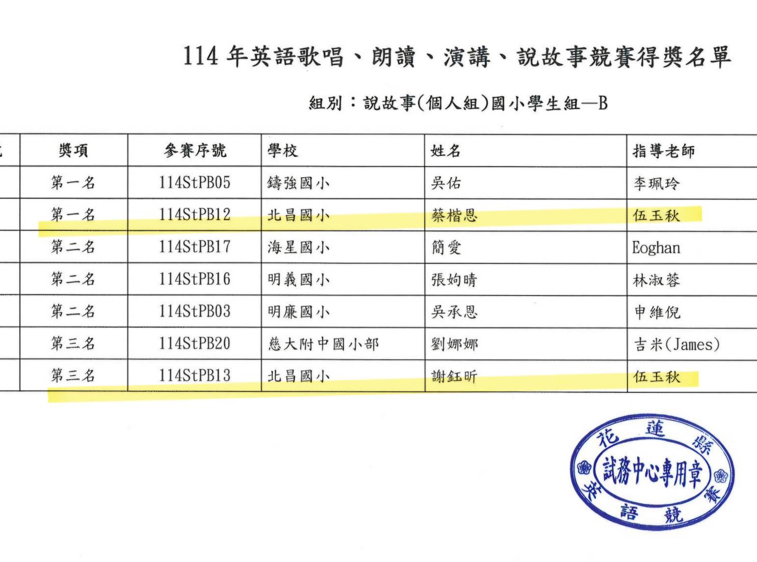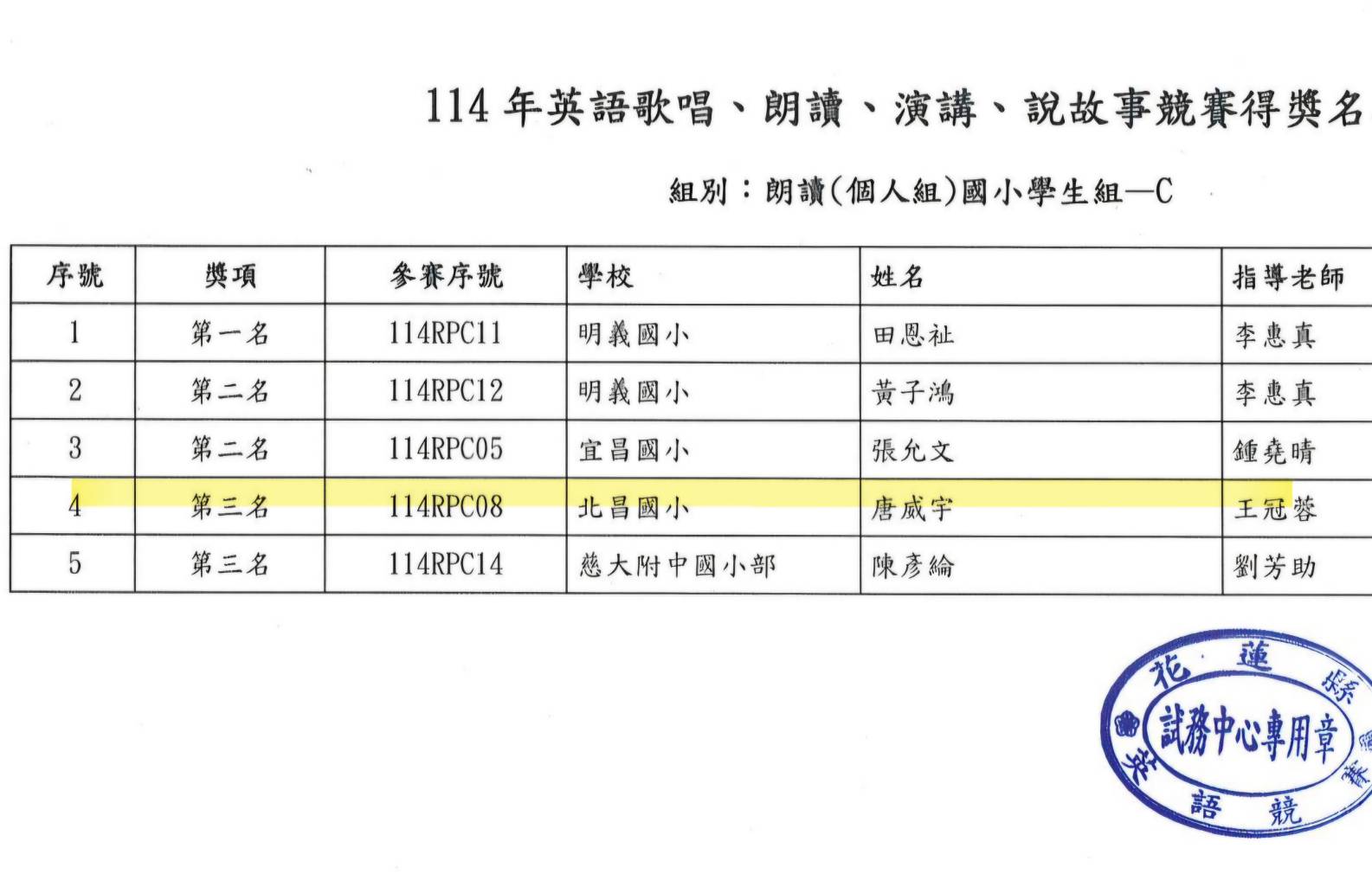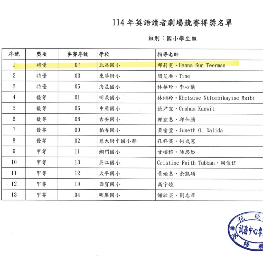 恭賀本校參加花蓮縣114年英語競賽成績斐然
