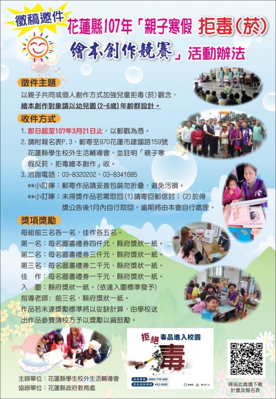 花蓮縣學生校外生活輔導會舉辦"親子寒假拒毒(菸)繪本創作競賽"活動資訊如下: