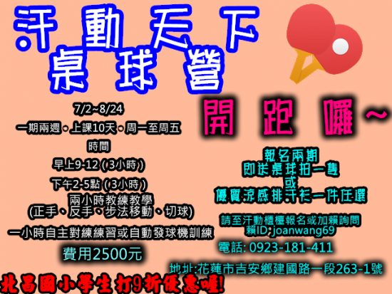 「汗動天下桌羽館」為本校桌球隊協力廠商,原訂在本校桌球室開辦夏令營,但因本校場地不若「汗動天下」舒適,恐影響孩子的學習成效,故全數移至「汗動天下」本館進行,凡是本校學生(在籍)均享受學費9折之優惠,詳情請參閱附件,並請自行報名。