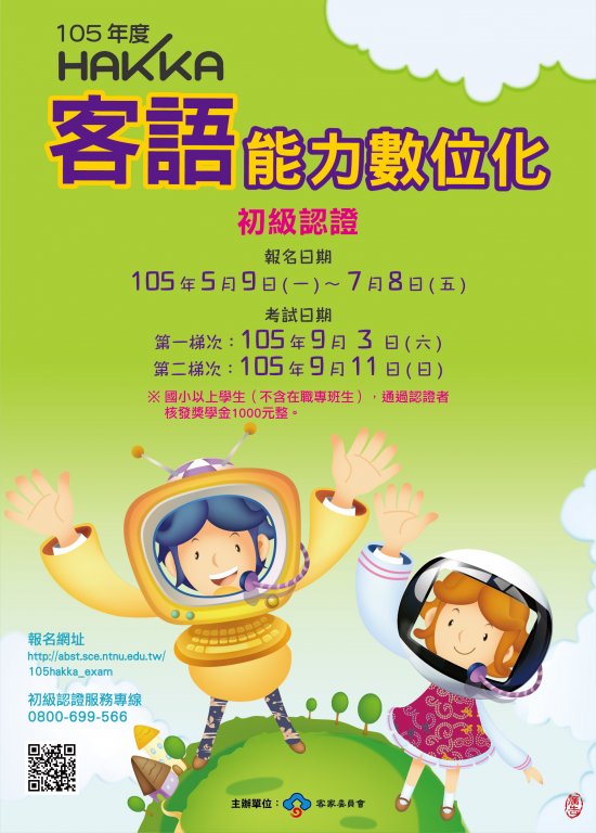 http://abst.sce.ntnu.edu.tw/105hakka_exam)」下載簡章與報名,相關問題請洽免費服務專線:0800-699-566。