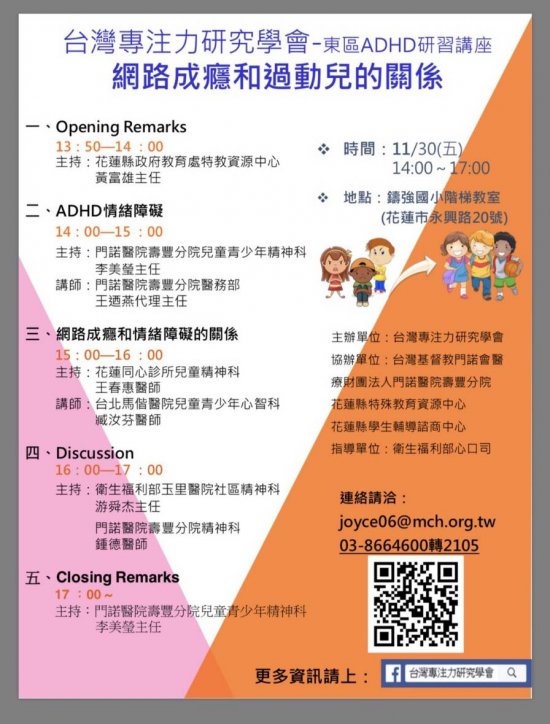 一、研習地點:本縣花蓮市鑄強國民小學階梯教室 二、研習時間:107年11月30日(五)14:00-17:00 三、參加對象:本縣國中小特教老師、普通班老師及家長 四、報名方式:請至全國特殊教育資訊網「研習報名」專區報名 (https://special.moe.gov.tw/study_login.php?id=708845) 五、全程參與之教師核發研習時數3小時。