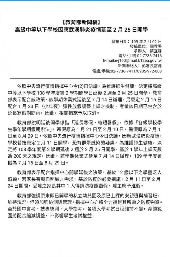 高級中等以下學校因應武漢肺炎疫情延至 2月25日開學