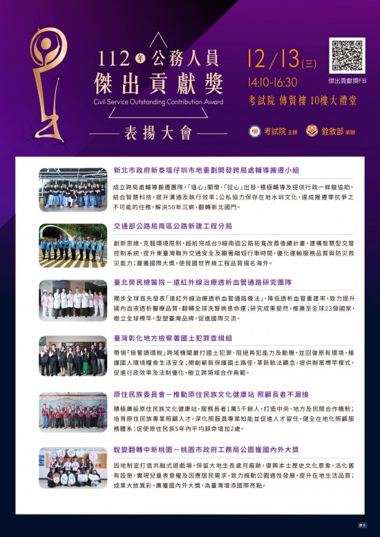轉知:有關銓敘部公告「112年公務人員傑出貢獻獎表揚大會」 海報及得獎者具體事蹟簡介,並轉知網路抽獎活動及表揚 大會直播等相關訊息。