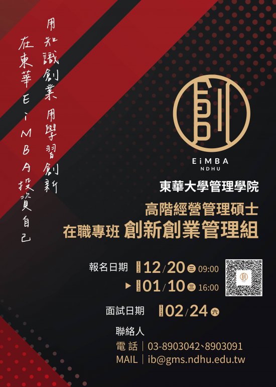 主旨: | 檢送本校管理學院高階經營管理碩士在職專班創新創業管理組113學年度碩士在職專班招生考試資訊,敬請惠予公告周知並轉知所屬,歡迎踴躍報考,請查照。 |