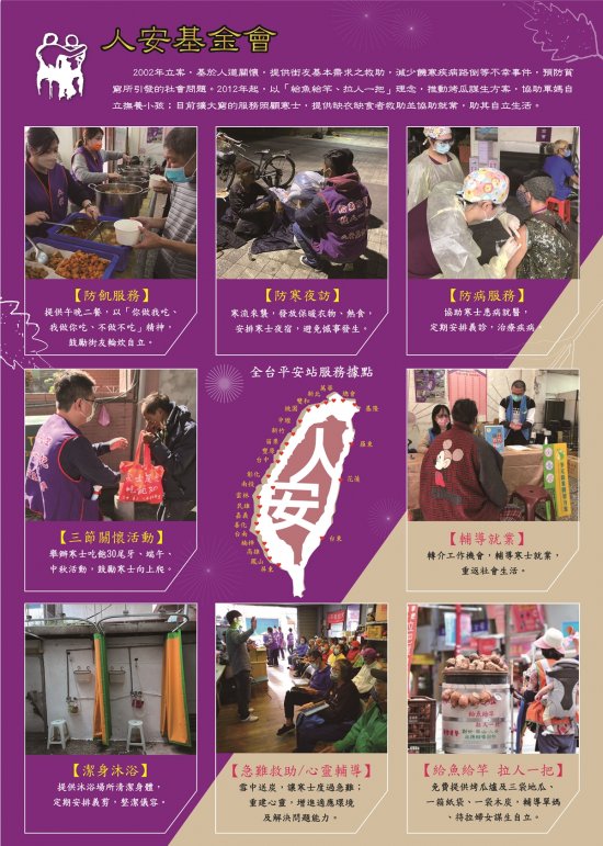 一、人安社會福利慈善事業基金會成立宗旨在維護人道、尊重生命,從事社會救助工作,自九十一年成立以來,秉持「給魚給竿拉人一把」理念,全台設立26處平安站服務街友、單媽、社會邊緣人等寒士,為求人間有愛、社會溫馨,推廣惜福宣導活動,將行善助人觀念從小扎根。盼能與本校合作,啟發學子對生命之尊重與珍惜,培養關懷社會之精神。