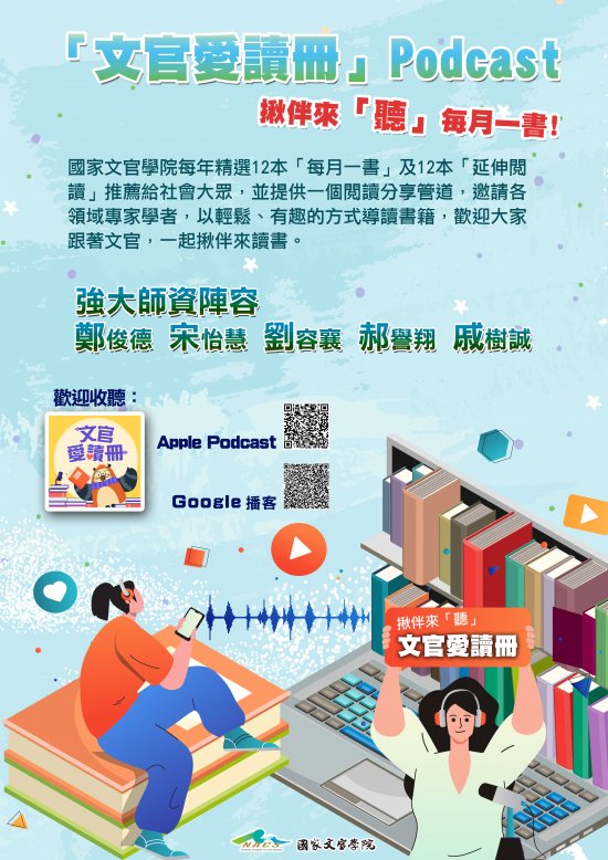 四、 | 另為擴大公務人員專書閱讀多元學習管道,國家文官學院自去年成立「文官愛讀冊」Podcast頻道,113年度起每月1號及15號將專書導讀音檔上架於「文官愛讀冊」Podcast頻道,亦請轉知所屬收聽並訂閱追蹤。 |