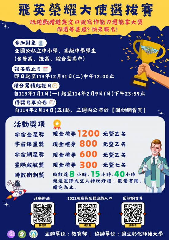 教育部『高中英語文口說及寫作遊戲開發與推廣計畫』推出「SDGs 飛英大使年度排行榜積分賽」,邀請學生成為「飛英大使」。此遊戲式教材結合SDGs主題影片與互動任務,幫助學生提升聽力、口說及寫作能力,並鼓勵學生持續運用該平台素材強化英語學習動機。