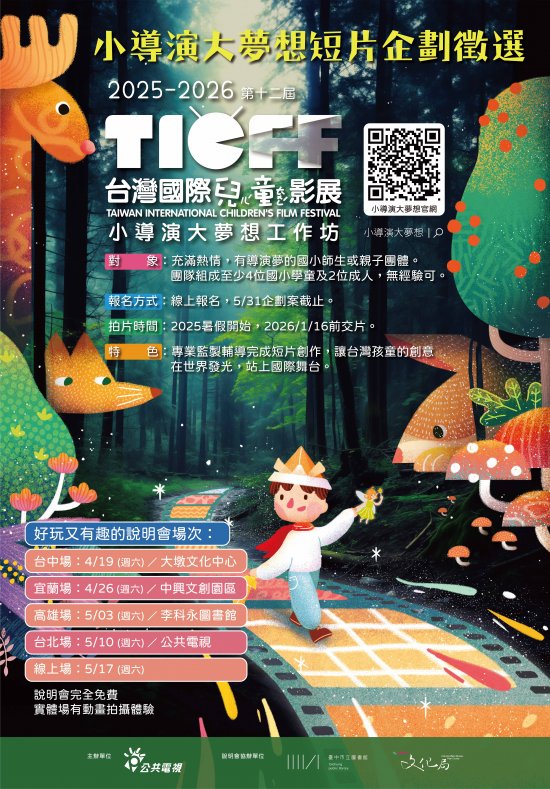 「兒童短片企劃案徵選」於2025/5/31截止收件,歡迎國小師生、親子團隊組隊上網報名。提出拍片企劃參加徵選,入選團隊可享整套拍片輔導資源,完成短片擇優送國際參展。相關活動細節請上活動官網