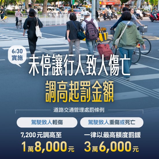 駕駛人請注意!交通部日前公告修正「違反道路交通管理事件統一裁罰基準及處理細則」,駕駛不停讓行人導致輕傷、重傷或死亡,將調高罰緩金額,且另有刑責。