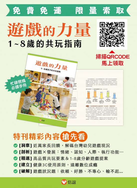 信誼基金會收集9,981份有效資料,分析並歸納2-8歲居家遊戲、友伴互動及3C使用等現況,並邀請腦科學、心理學與幼教等專家解讀遊戲背後的發展密碼,編纂《遊戲的力量:1-8歲孩子的共玩指南》特刊,。即日起,開放【免費免運索取】,歡迎家長線上索閱訊息。