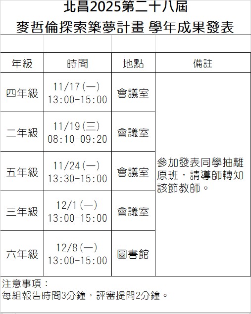 北昌國小2025第二十八屆麥哲倫探索築夢計畫學年成果發表時程